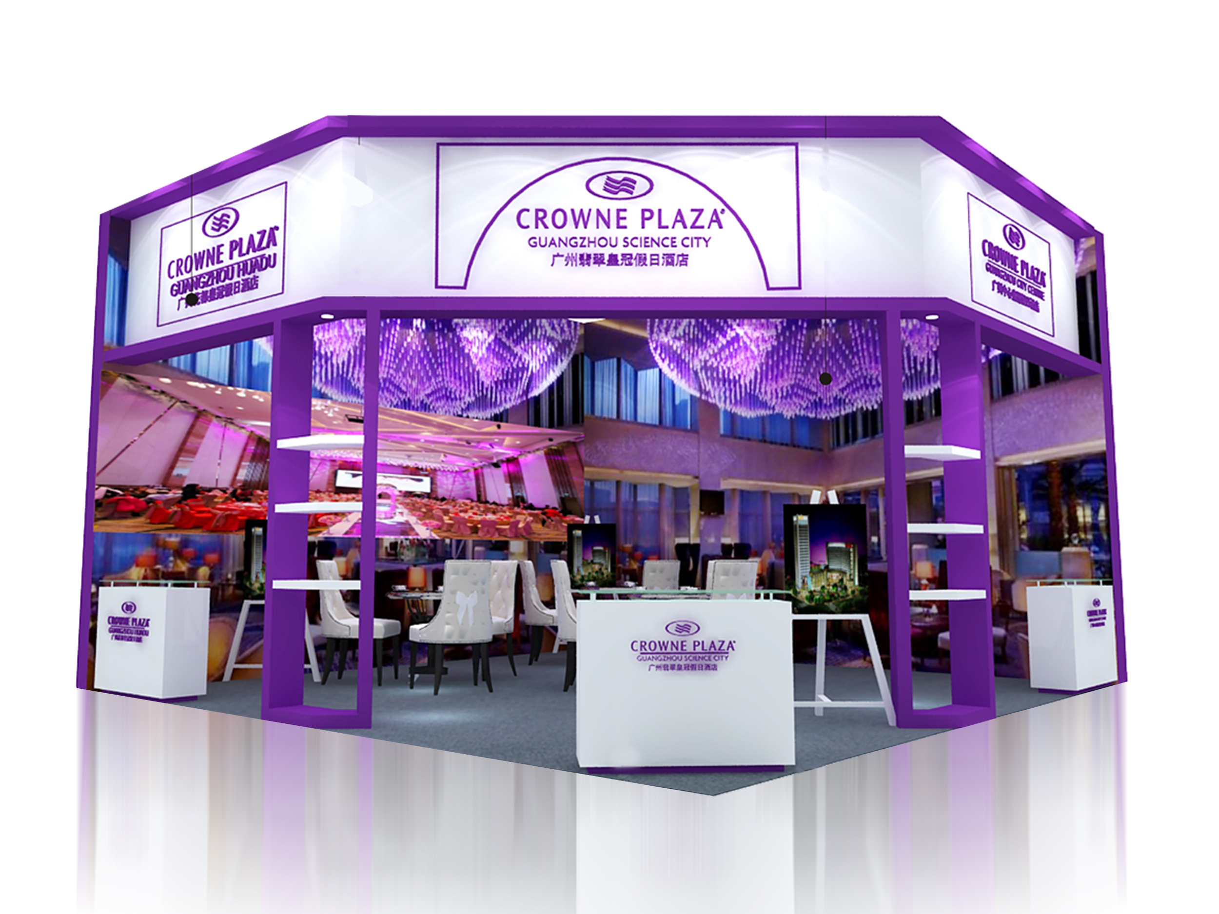 契合皇冠假日酒店品牌形象和產(chǎn)品特性,采用立體結(jié)構(gòu),再搭配燈具燈光的效果,襯托出展位浪漫、硬朗的氛圍,突出一種融合、個(gè)性的時(shí)尚品味。