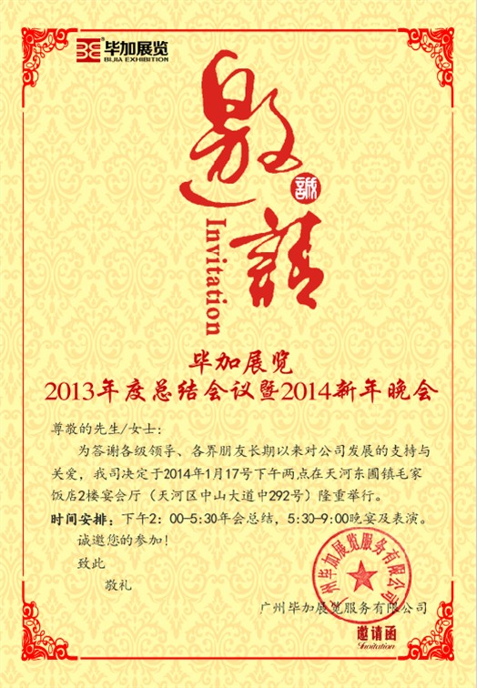為答謝各級(jí)領(lǐng)導(dǎo)、各界朋友長(zhǎng)期以來(lái)對(duì)公司發(fā)展的支持與關(guān)愛(ài),我司決定于2014年1月17號(hào)下午兩點(diǎn)在天河?xùn)|圃鎮(zhèn)毛家飯店(天河區(qū)中山大道中292號(hào)勝凱女人街2樓)宴會(huì)廳隆重舉行“畢加展覽2013年度總結(jié)會(huì)議暨2014新年晚會(huì)”,歡迎廣大新老客戶朋友們參加觀看。