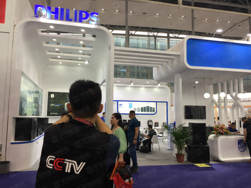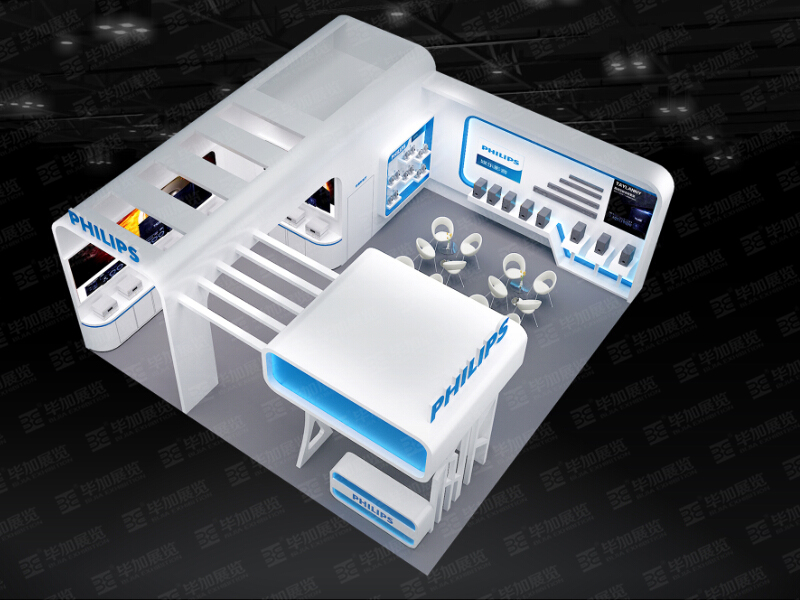 契合飛利浦的品牌形象和產(chǎn)品特性,采用藍(lán)白色彩,再搭配燈具燈光的效果,襯托出展位先進(jìn)科技的氛圍,突出一種簡潔大方的風(fēng)格。