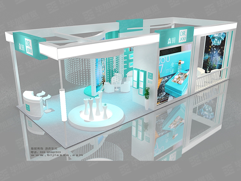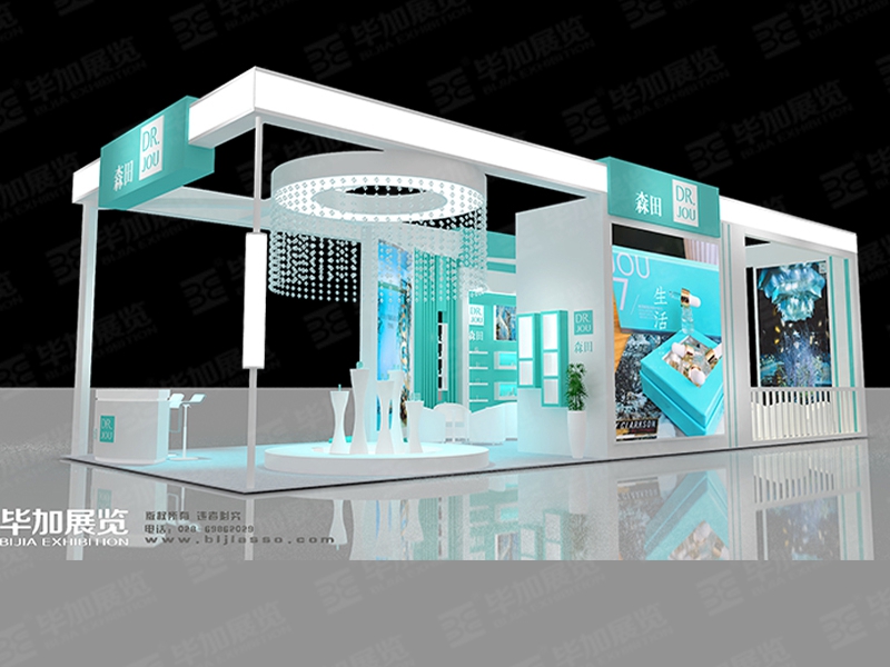 運用白色,藍綠色搭配,著重突出品牌和產(chǎn)品的展示,使整個展位浪漫優(yōu)雅又時尚新穎。