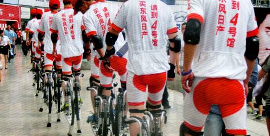 咋一看,還以為到了運(yùn)動(dòng)會(huì)現(xiàn)場(chǎng),仔細(xì)觀察原來(lái)是宣傳展臺(tái)位置??磥?lái)展商在宣傳展臺(tái)時(shí),無(wú)需大吼,只要讓“高蹺隊(duì)”整齊劃一地在現(xiàn)場(chǎng)遛一下,相信觀眾不朝他們看都難。